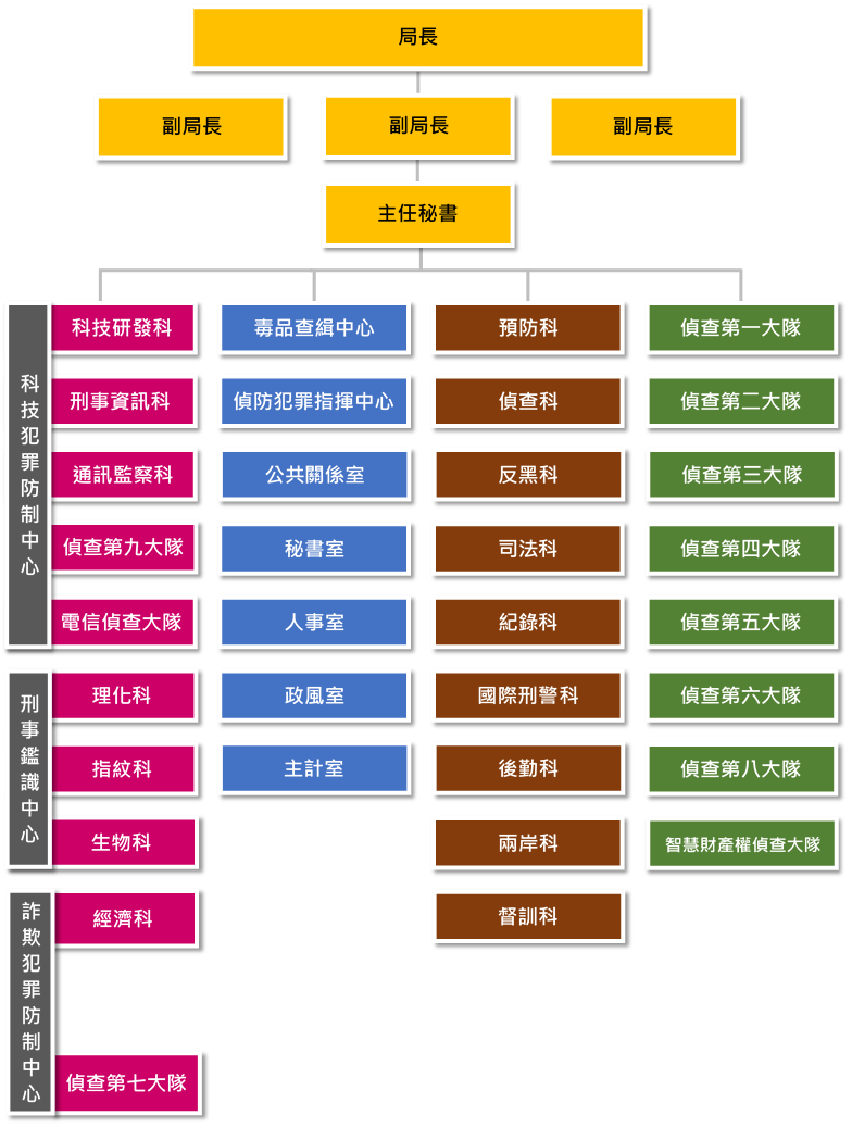 預防科、偵查科、反黑科、司法科、紀錄科、國際刑警科、後勤科、兩岸科、經濟科、督訓科。