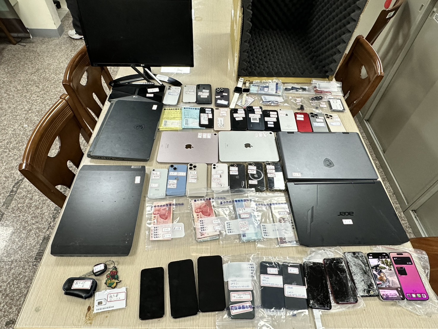 五、查獲贓證物:手機34支、平板2台、筆電4台、新臺幣(下同)14萬3,200元、自小客車4輛(1輛賓士市價約435萬、1輛三菱市價約81.9萬、2輛豐田市價合計約433萬)、工作隔音箱等證物。
