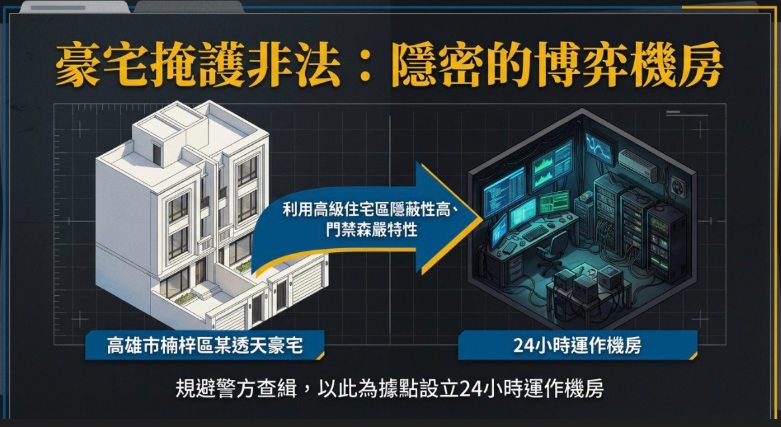 (一)豪宅掩護非法機房,專案小組強力掃蕩:刑事警察局偵查第八大隊接獲情資,有犯罪集團藏身高雄市楠梓區某透天豪宅,從事詐欺及博弈等犯罪,本大隊立即與相關單位共組專案小組,報請臺灣橋頭地方檢察署檢察官黃聖淵指揮偵辦。
