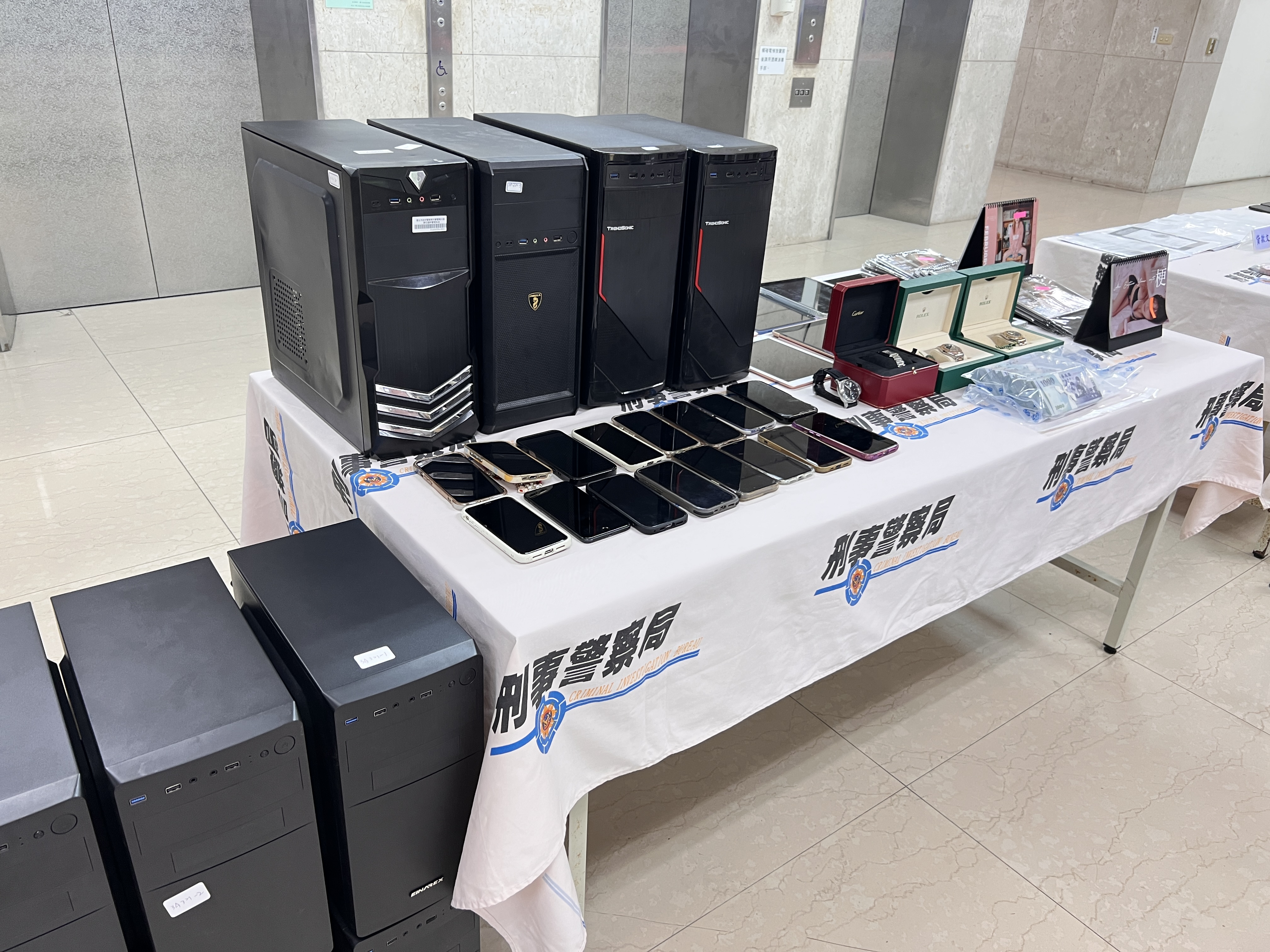 五、查獲贓證物:現金新臺幣68萬元、進口跑車(BMW)2部、名錶3支、犯案電腦主機35台、平板電腦10台、工作手機70支、公司大小章等證物。