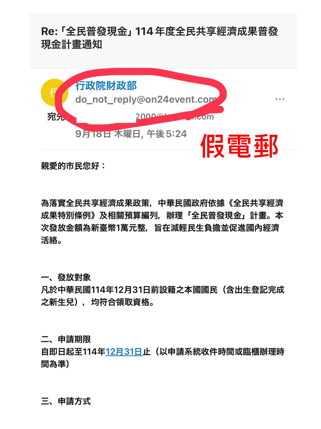 刑事警察局165詐騙諮詢專線統計,自114年8月普發現金議題發酵開始,民眾檢舉釣魚網站9件、檢舉詐團以民眾身分遭冒用,需監管民眾帳戶84件,且已有民眾點擊釣魚網頁上當受騙,民眾經假冒政府Email連接假網址後,以假亂真的網頁教民眾輸入信用卡資訊,遭詐團盜刷外國貨幣、遊戲點數和禮券,收到簡訊驗證碼時,竟不疑有他的輸入OTP驗證碼,遭盜刷5萬多元。