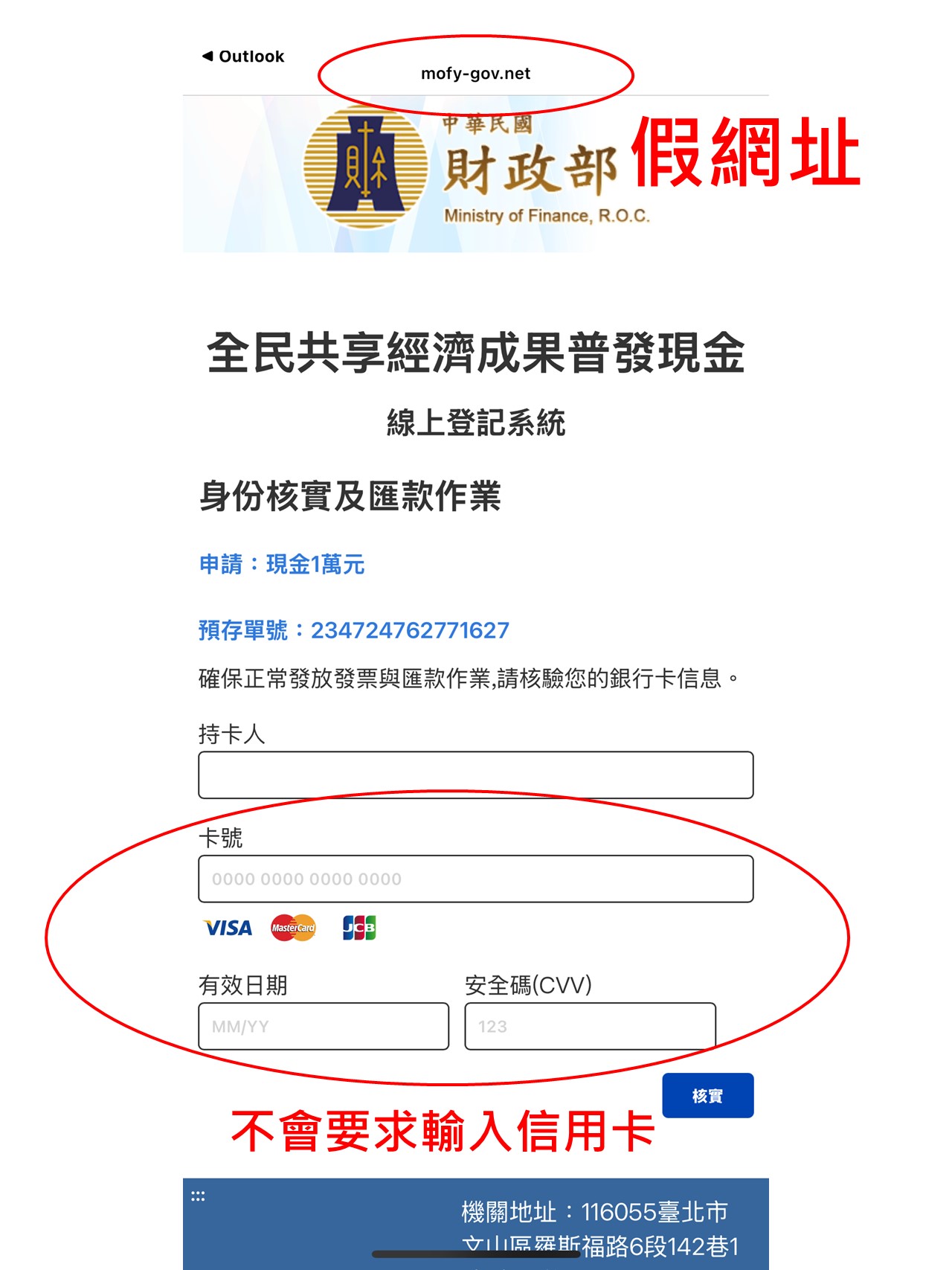 詐騙集團的首波攻擊手法,是以大量發送假冒政府機關的電子郵件及釣魚簡訊,內容多為「普發現金已開放登記」、「點此查詢領取資格」或「請盡速完成資料驗證」等,誘騙民眾點擊惡意連結,企圖竊取銀行帳號、信用卡資訊、身分證字號等重要個資。