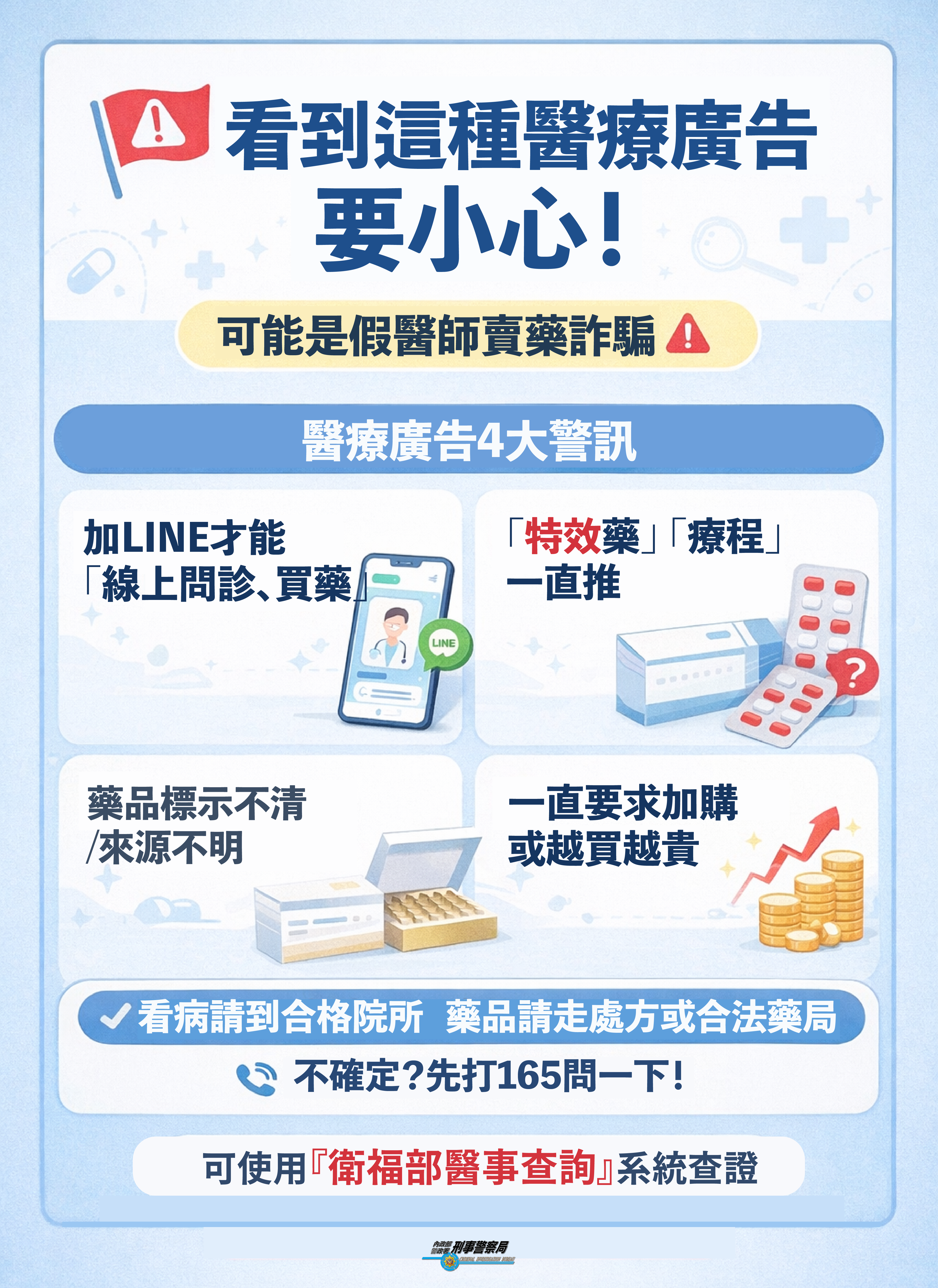 刑事警察局分析指出,詐騙集團近來濫用AI科技,得以輕易冒用專業人士身分,於網路販售不實商品。尤其假冒專科醫師高價兜售藥品的詐騙手法近期有升溫趨勢,甚至以AI生成虛構醫師形象與賣藥影片,藉此取得民眾對「白袍專業」的信任。形事警察局提醒,醫療行為應於實體醫療院所進行,民眾切勿單憑網路一頁式廣告或未經實名認證之社群帳號詢問偏方;藥品亦應透過醫師處方箋或合法藥局取得,切勿食用包裝標示不清、來源不明的藥品,以免延誤就醫時機,對健康造成難以回復的傷害。如對醫師身分或醫療機構感到存疑,可上衛福部醫事查詢系統確認( https://ma.mohw.gov.tw/Accessibility ),或上打詐儀錶板( https://165dashboard.tw )了解相關詐騙手法及撥打165反詐騙諮詢專線查證。